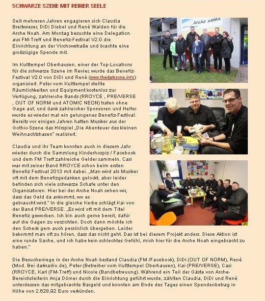 Heute 19.01.2015 ging es zum Kinderhospiz Arche Noah Gelsenkirchen und wir konnten eine Summe von 1891,42 Euro vom Benefiz Festival V2.0 Kulttempel