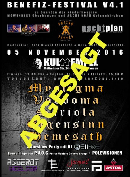 Für die Freunde des Dark Rock und vielleicht sogar interessenten vom geplanten Benefiz Festival V4.1 im November 2016 müssen wir leider dazu absagen.